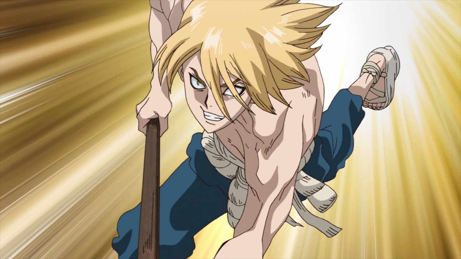 Dr. Stone Season 1 Episode 18 Stone Wars Tsukasa’s army is coming! Kinro struggles to hold the bridge against the deadly spearman Hyoga and his shock troops, but Senku and the villagers are ready with deadly new weapons of science! dr-stone-ep-18
