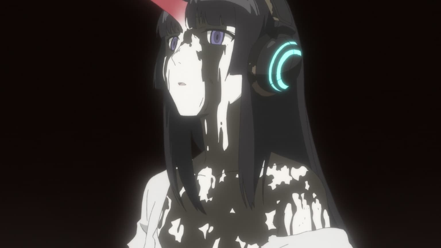 FLCL Season 2 Episode 1 Re: Start Hidomi’s Dream – white ash covers the entire ruins, behind which a row of humongous irons comes thundering after Hidomi who is now a zombie. flcl-ep-1